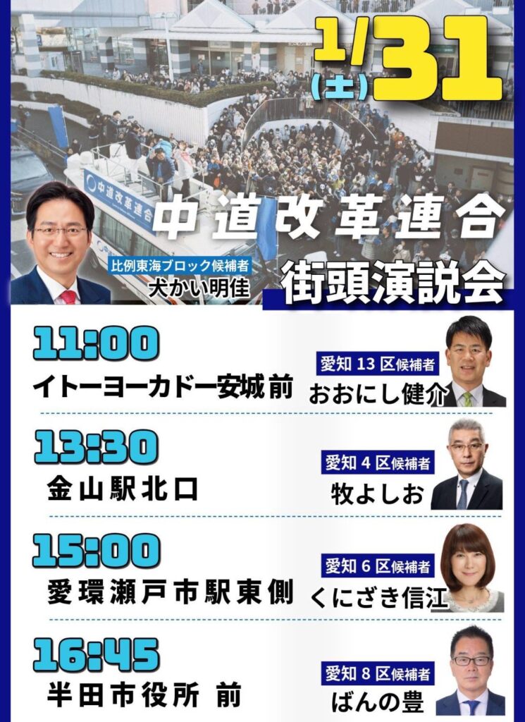 【1/31(土) 11:00〜/13:30〜/15:00〜/16:45〜】中道改革連合 街頭演説会