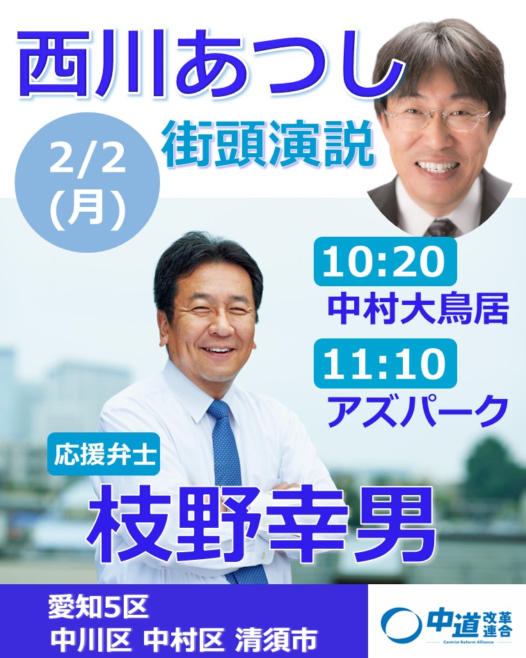 中道改革連合 西川あつし(愛知5区/名古屋市中村区・中川区、清須市)の街頭演説を実施します。 日時2月2日(月)10:20〜開催場所中村大鳥居応援弁士枝野幸男 前衆議院議員 日時2月2日(月)11:10〜開催場所アズパーク応援弁士枝野幸男 前衆議院議員 日... -
