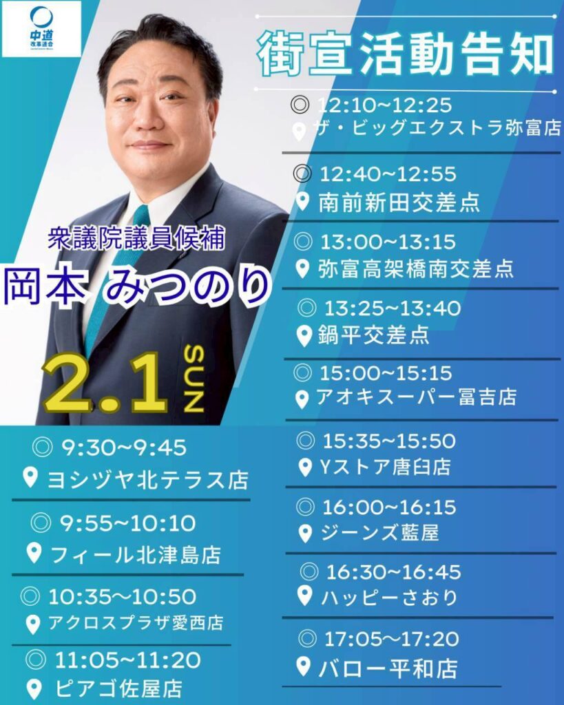 中道改革連合 岡本みつのり (愛知9区/稲沢市、津島市、あま市、愛西市、弥富市、大治町、蟹江町、飛島村) 2月1日に計13回の街宣活動を実施します。 -